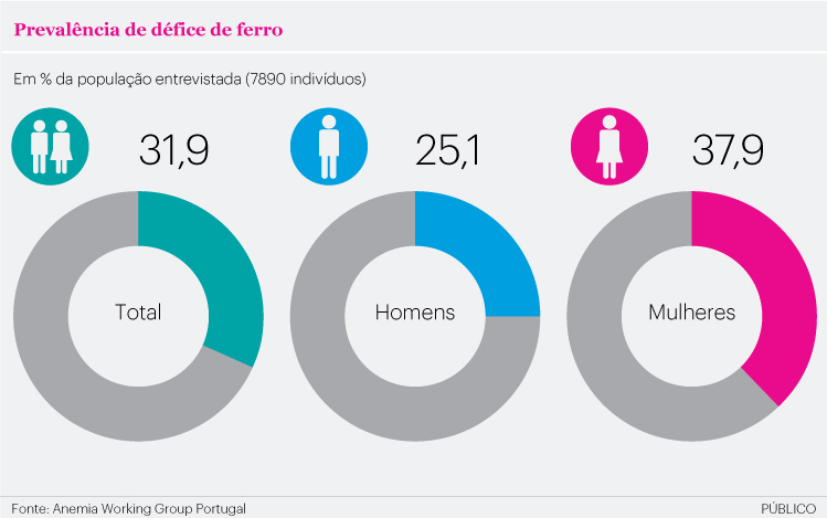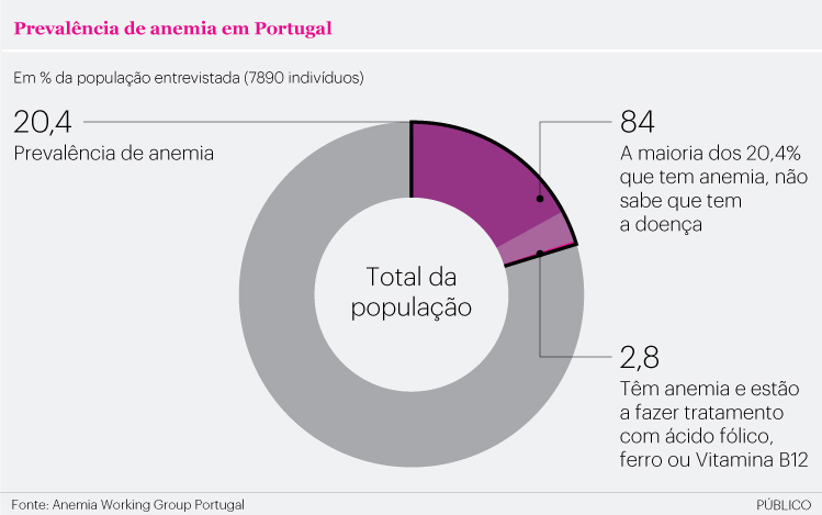 De acordo com os dados de uma notícia publicada no jornal Público (vide www.publico.pt/n1692501), cerca de 1/5 da população portuguesa (20%) apresenta anemia, constituindo um número superior ao que se supunha, podendo esta situação ainda piorar. Acresce o facto, da maioria da pessoas desconhecer possuir esta situação clínica. Um terço da população apresenta carência de ferro, o que é uma das principais causas da anemia.